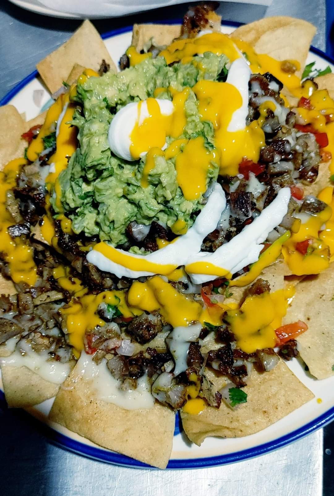 totopos, queso asadero, queso cheddar, crema, pico de gallo, guacamole y carne asada