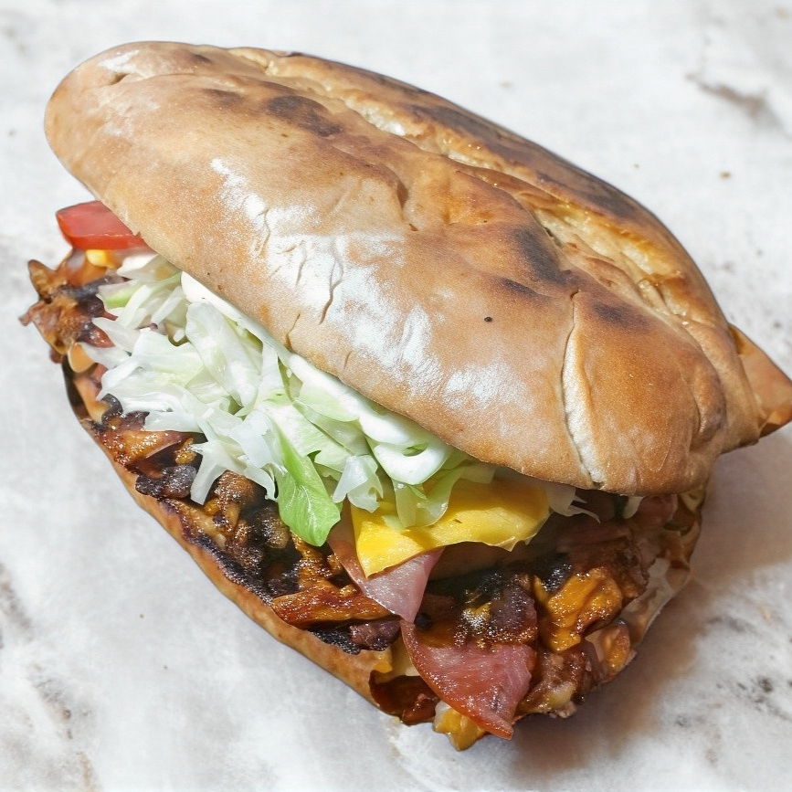 Rico pan torreon con carne a elegir preparada con frijoles refritos,jamon,queso asadero,queso amarillo,lechuga,tomate,cebolla,aguacate,mayonesa y envuelta en tocino.