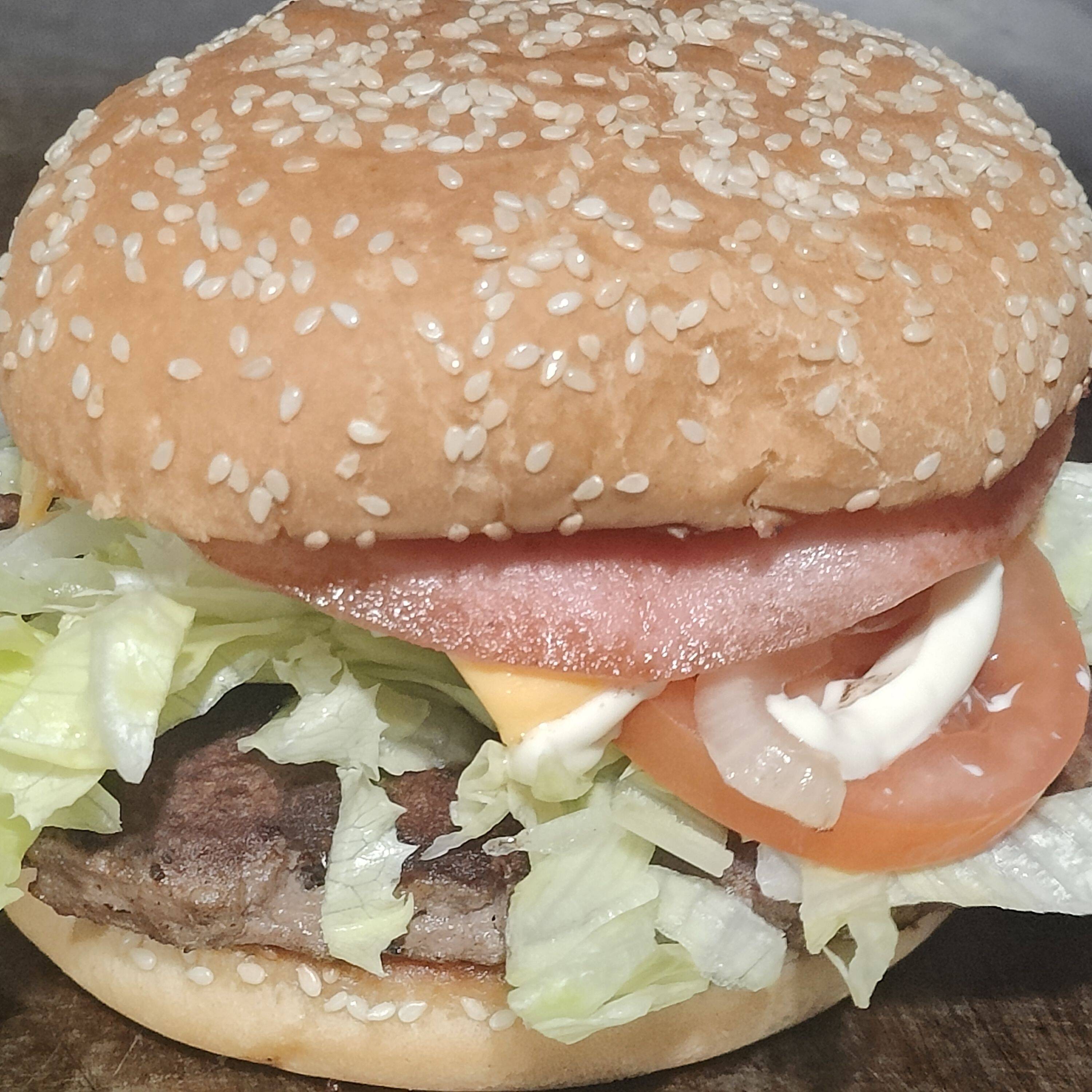 Hamburguesa de res ,con carne asada,jamon,queso amarillo,queso asadero,salchicha,lechuga,tomate,cebolla,aguacate,mostaza,catsup y mayonesa acompañado con pocion pequeña de papas.