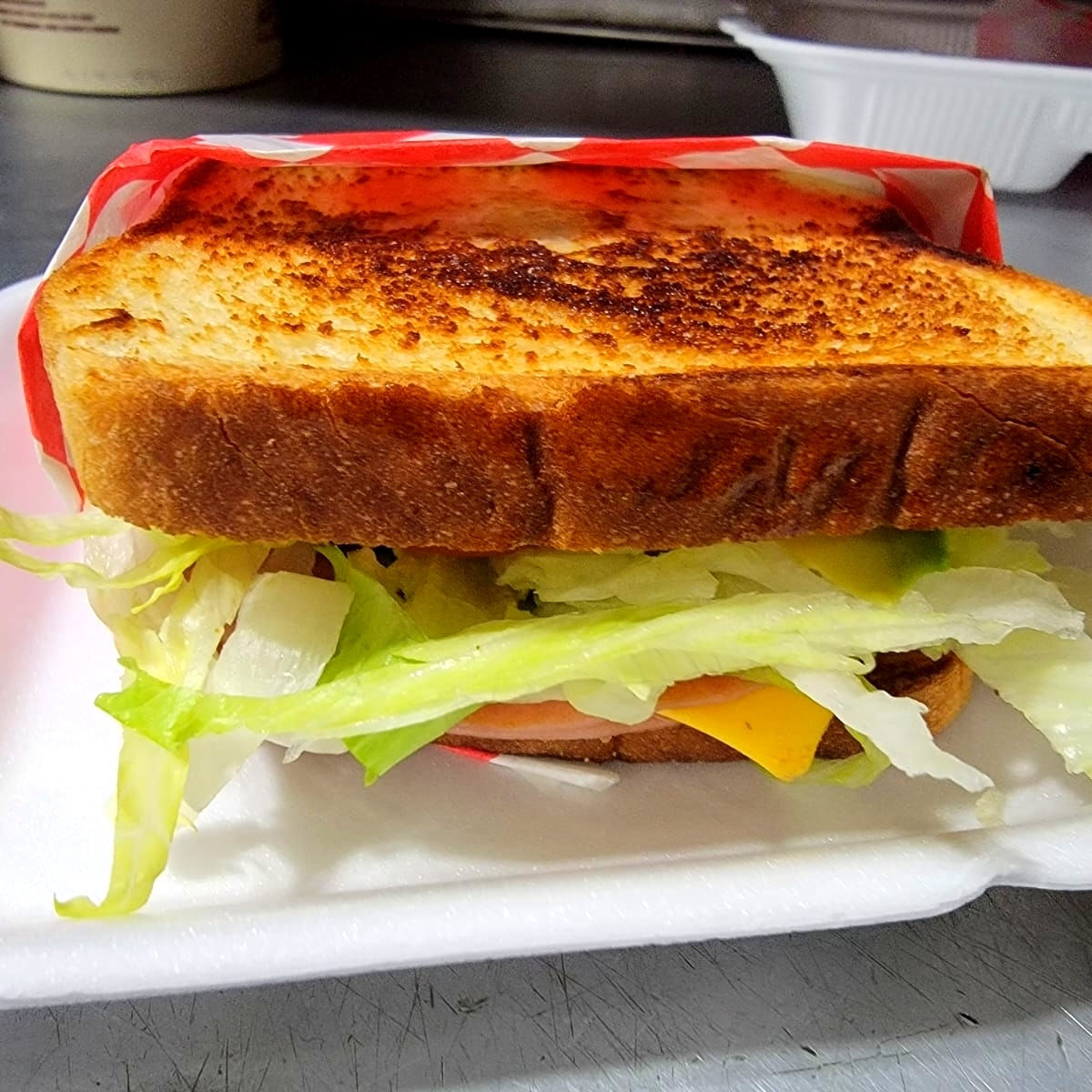 Sandwich de jamon (dos rebanadas)queso amarillo,lechuga,tomate,cebolla,aguacate,mayonesa,ojo sin papas.I