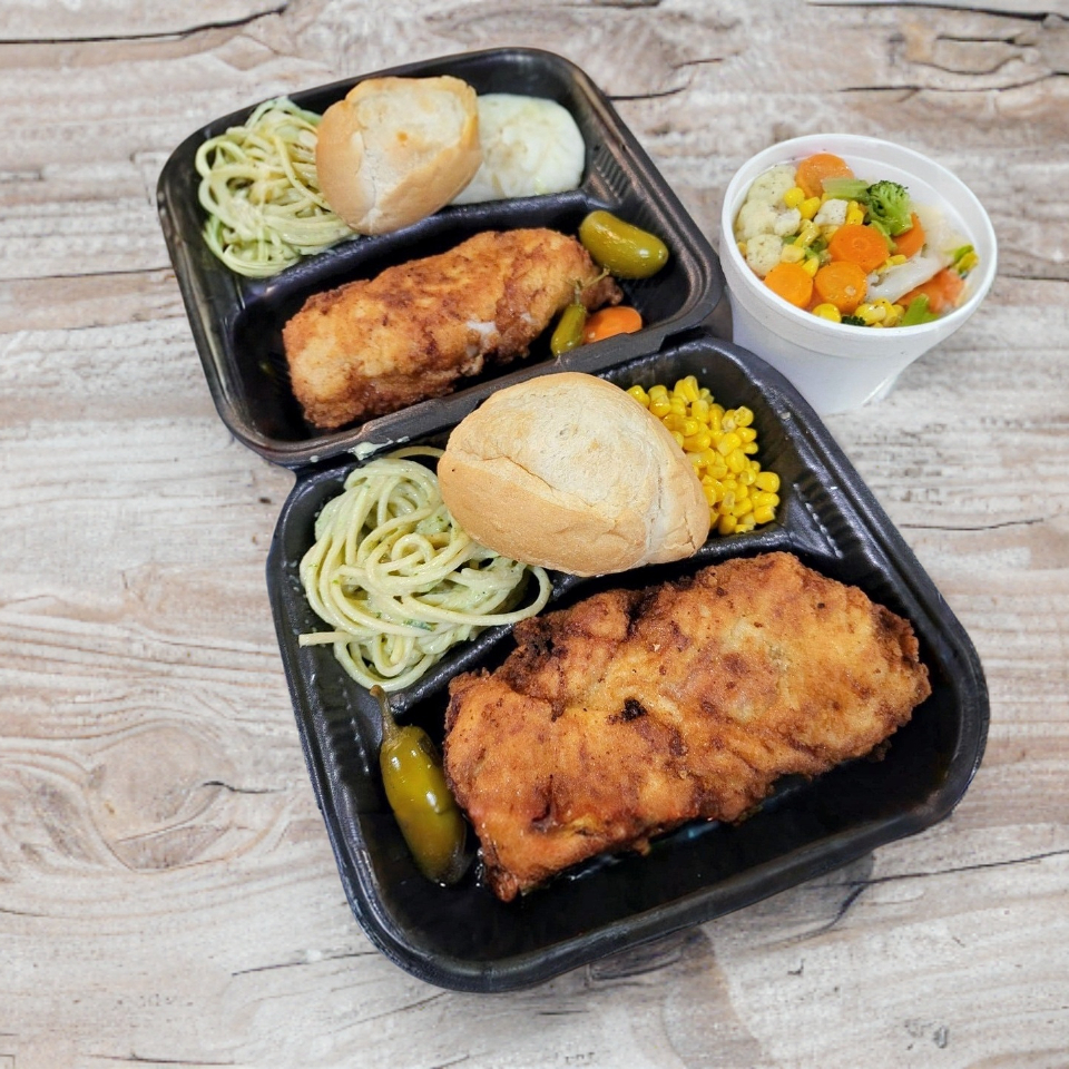 MILANESA DE POLLO EMPANIZADA, ACOMPAÑADA DE SPAGUETTI POBLANO Y ELOTE