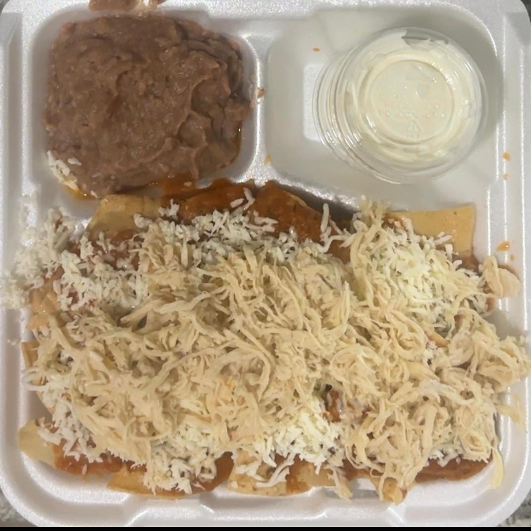 totopos bañados en salsa de tomate con chile jalapeño acompañados de frijoles, queso y pollo