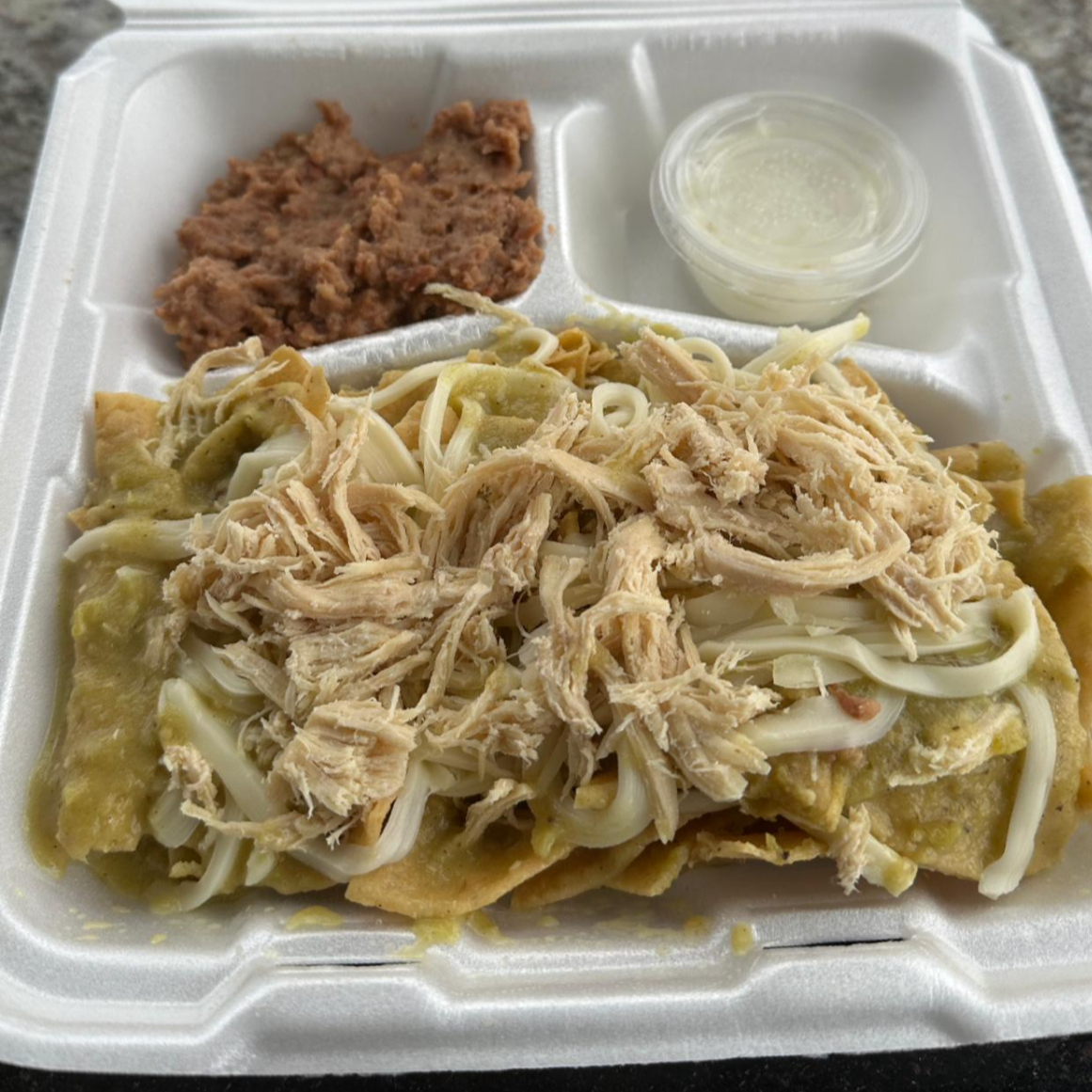 chilaquiles bañados en salsa verde con queso, pollo y porcion de frijoles