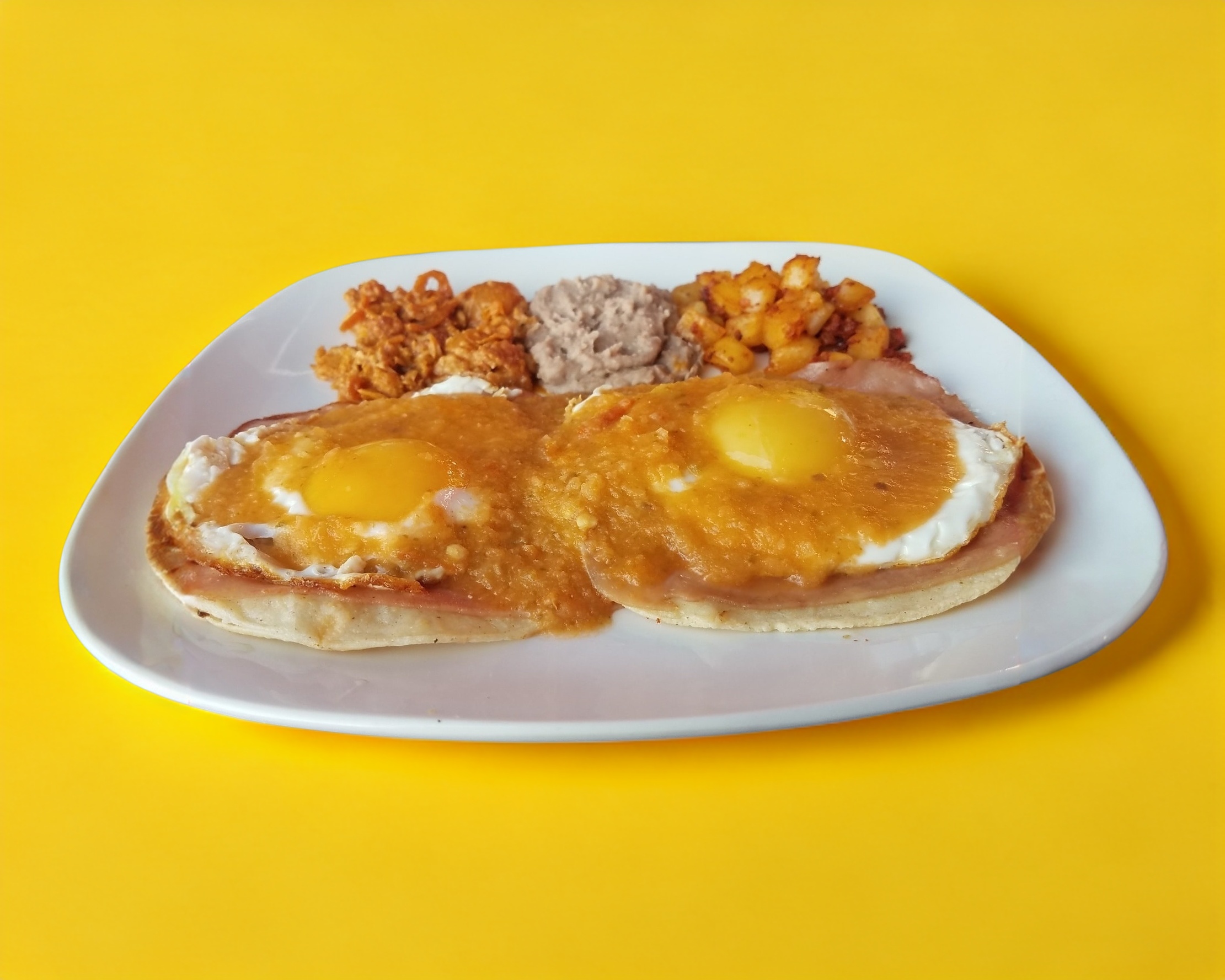 Huevos estrellados, sobre tortilla de maíz con jamón, bañados en salsa. Acompañados de chicharrón, frijoles y papas con chorizo.