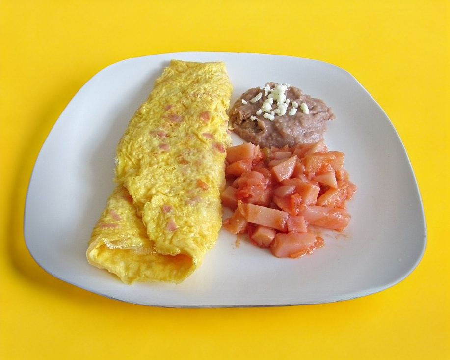 Jamón y queso. Acompañados de frijoles refritos y papas a la mexicana.