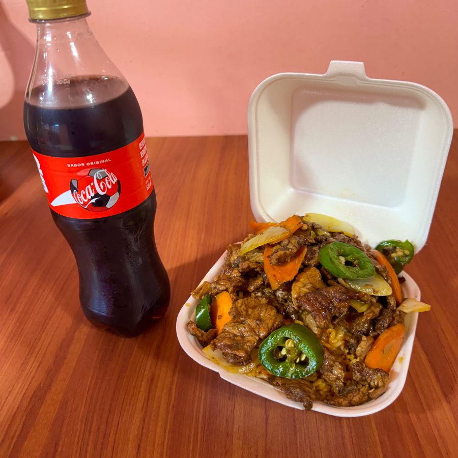 Inluye un plato de 1 guisado con arroz o pasta, una galleta de la suerte y una soda de 600 ml.