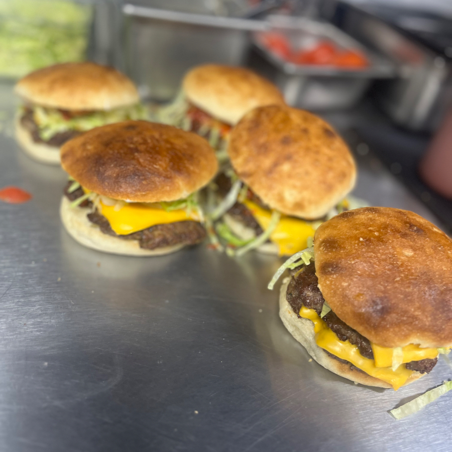 Cheeseburger carne casera , con pan Margarita , queso amarillo , lechuga , tomate , mayonesa,mostaza,ketchup,jalapeños
