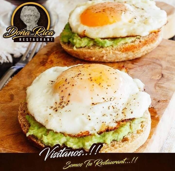 1 Pan partido a la mitad con guacamole y encima de cada mitad lleva 2 huevos estrellados.