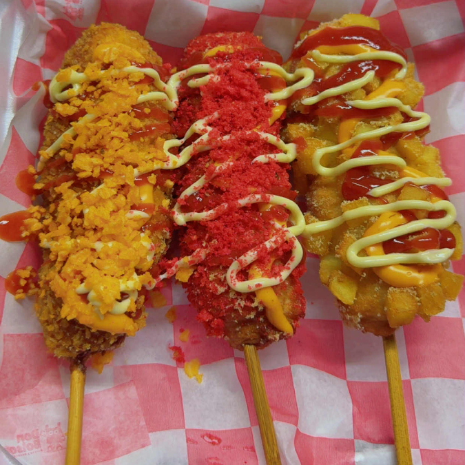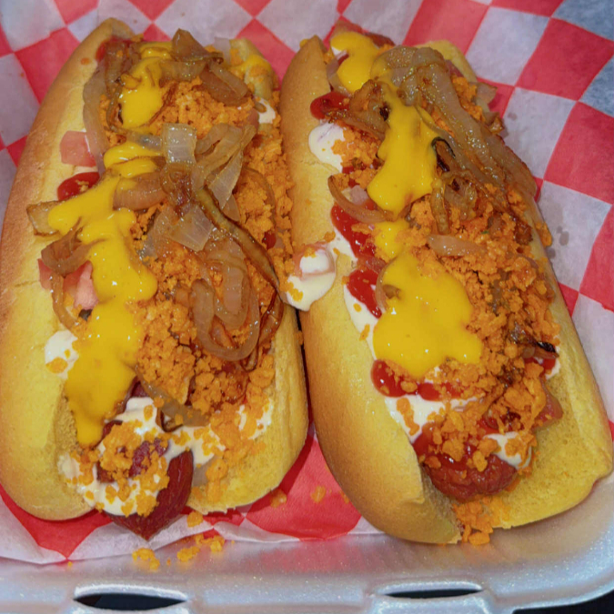 2 hotdogs bañados con sabritas de su eleccion y una coca de bote