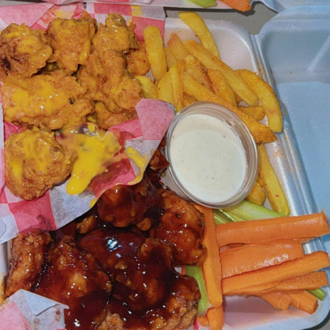 4 TENDERS DE POLLO CON UNA SALSA ESPECIAL ESTILO AMERICANO CON PAPAS Y ENSALADA DE REPOLLO