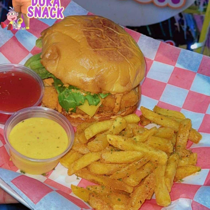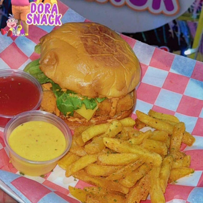 hamburguesa de tiras de pollo estilo americano con queso manchego lechuga tomate y una salsa de mayonesa especial