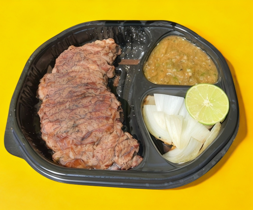 Platillo con corte de 350 g de new york angus, acompañado de salsa, cebolla y tortillas.