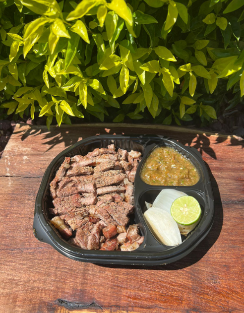 Platillo con 500 g de aguja asada, acompañado de salsa, cebolla y tortillas.