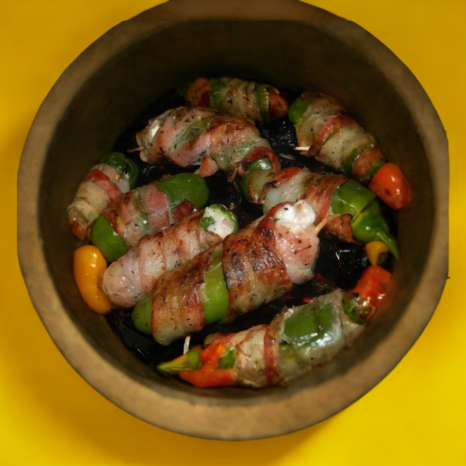 Jalapeño asado, relleno de queso Philadelphia y envuelto en tocino.
