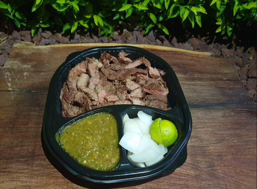 Platillo con 400 g de diezmillo angus, acompañado de salsa, cebolla y tortillas.