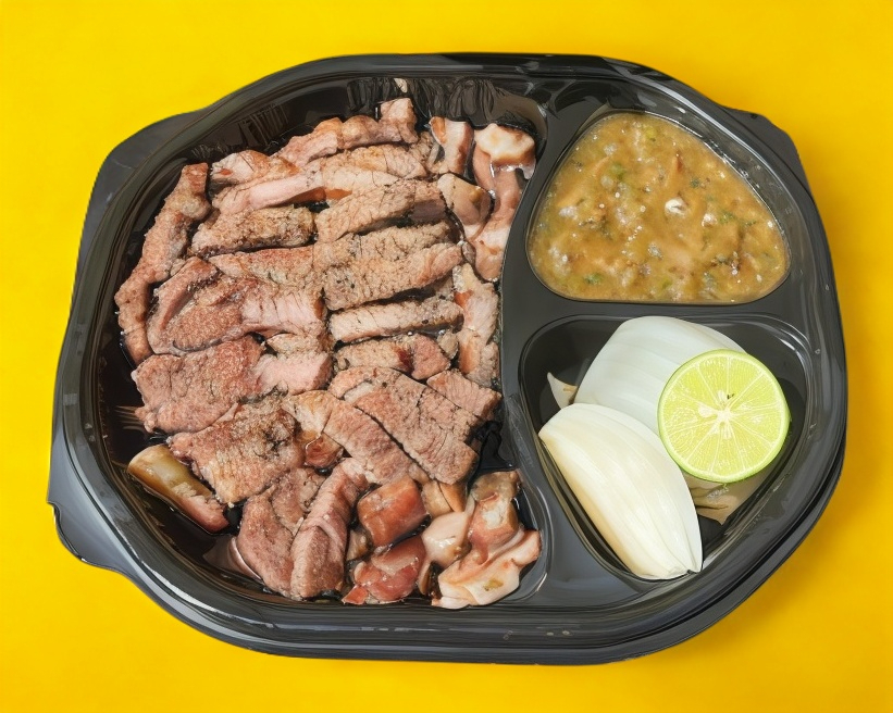 1/2 kg de brisket, acompañado de salsa, cebolla y tortillas.
