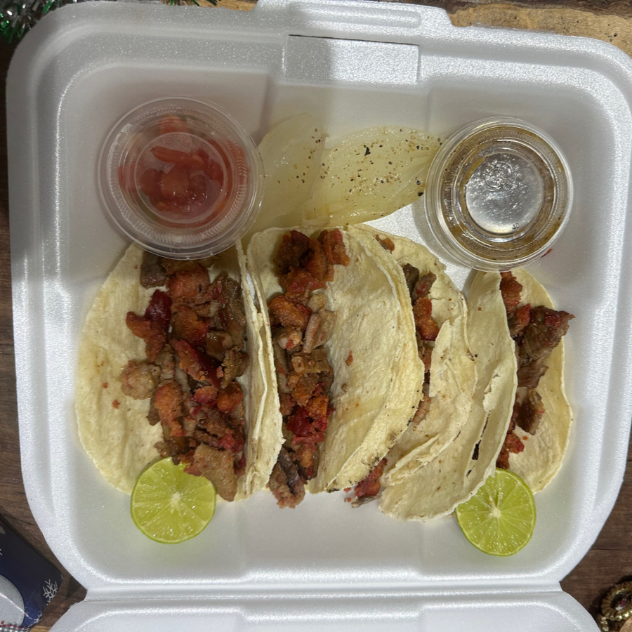 1/2 kg de pollo deshuesado, acompañado de salsa, cebolla y tortillas.
