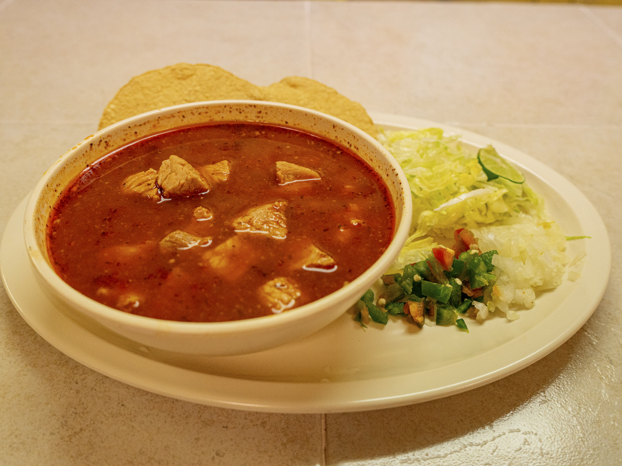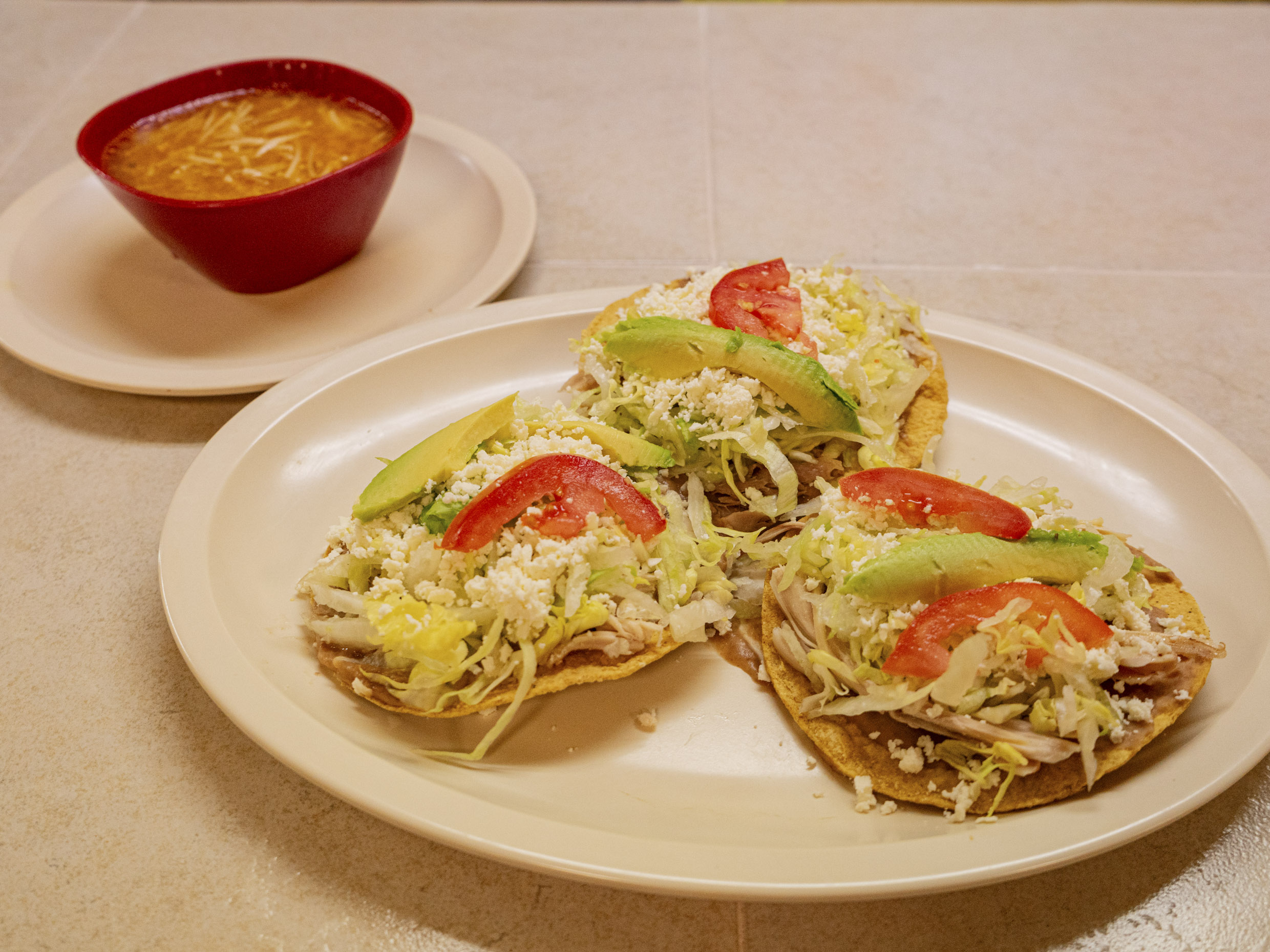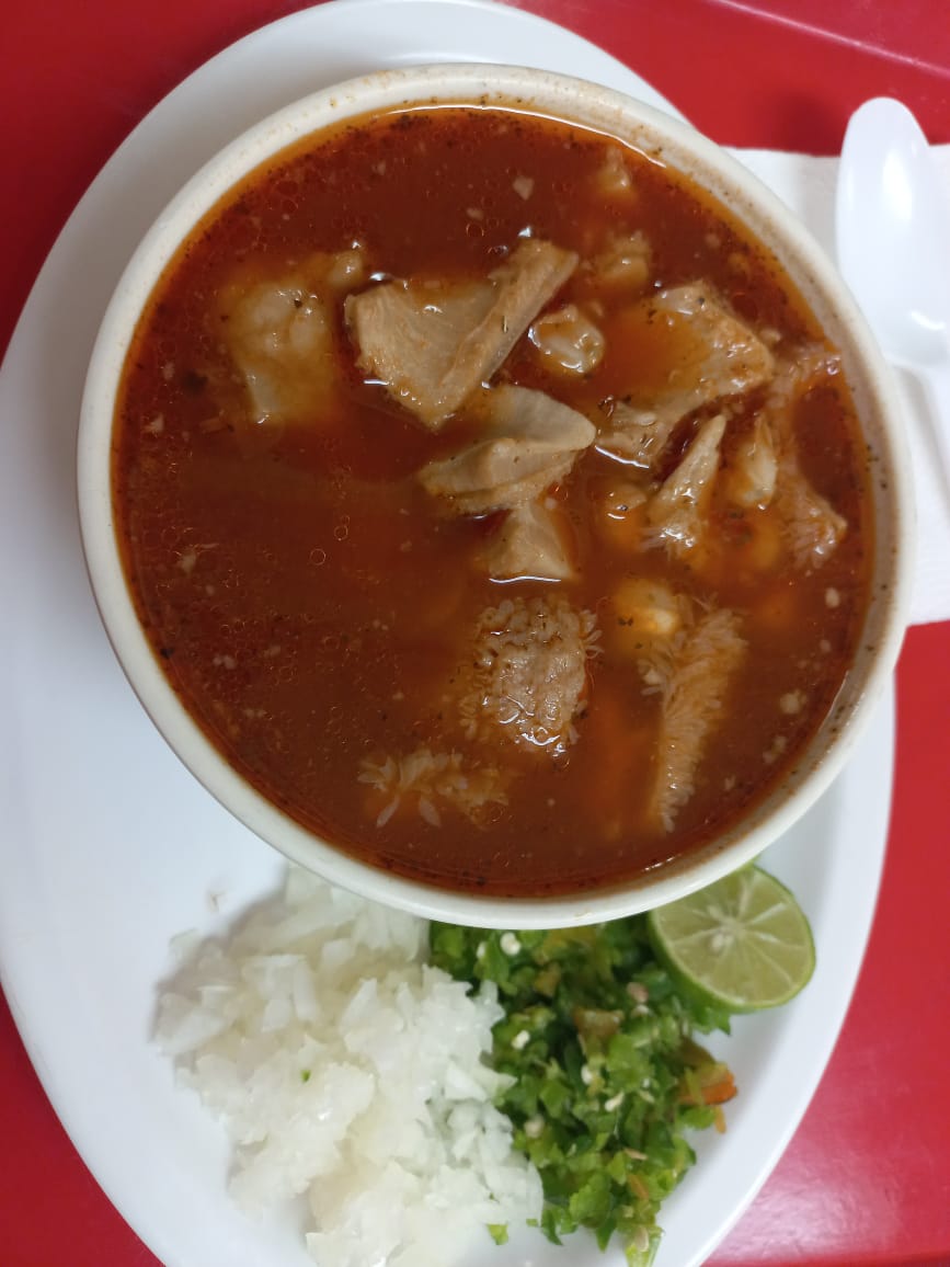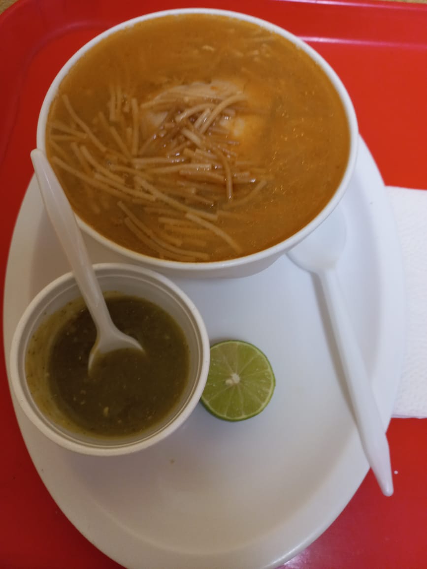 Caldo de pollo guisado con chipotle, una pieza de pollo, queso, aguacate y chipotle.