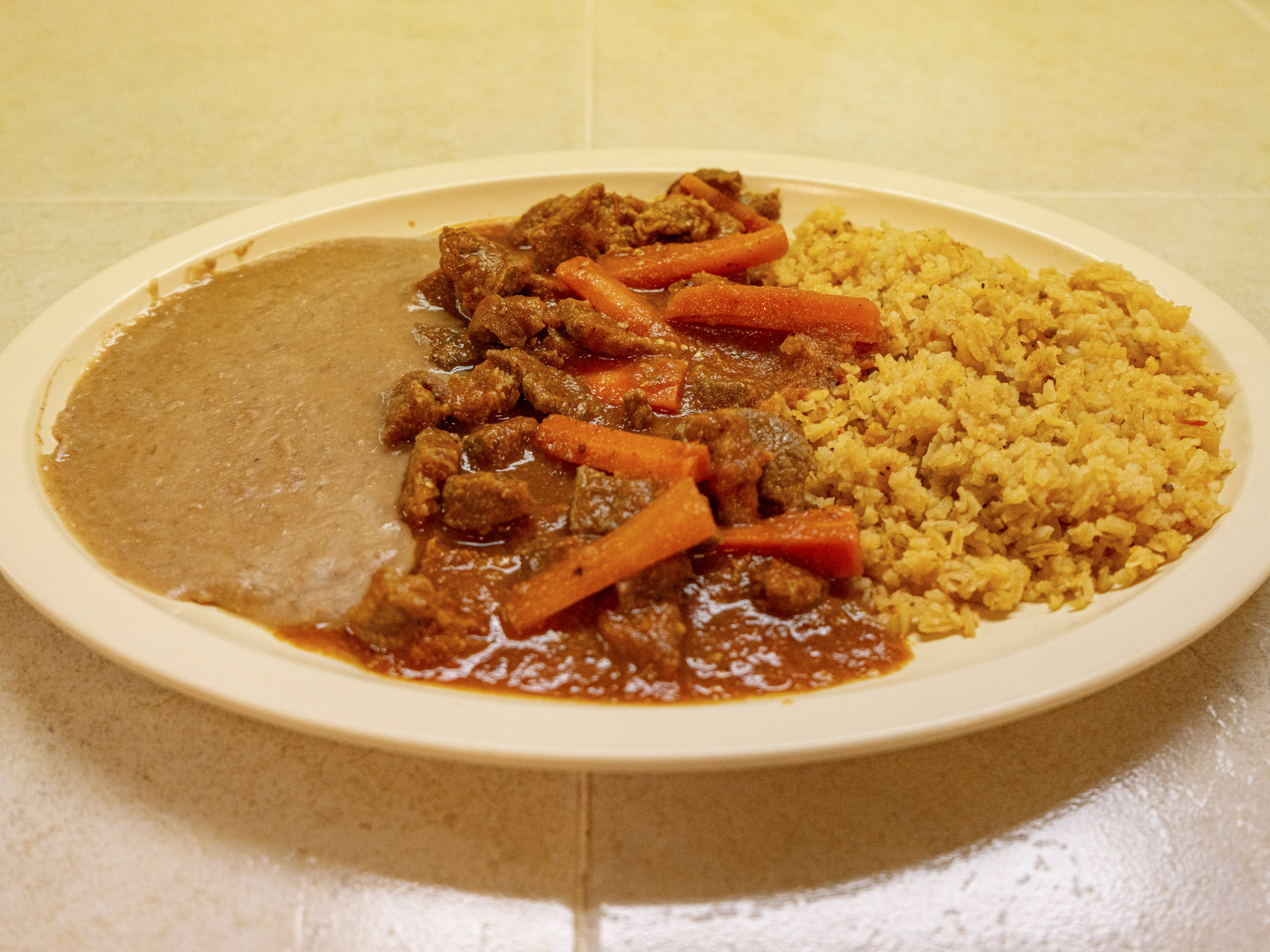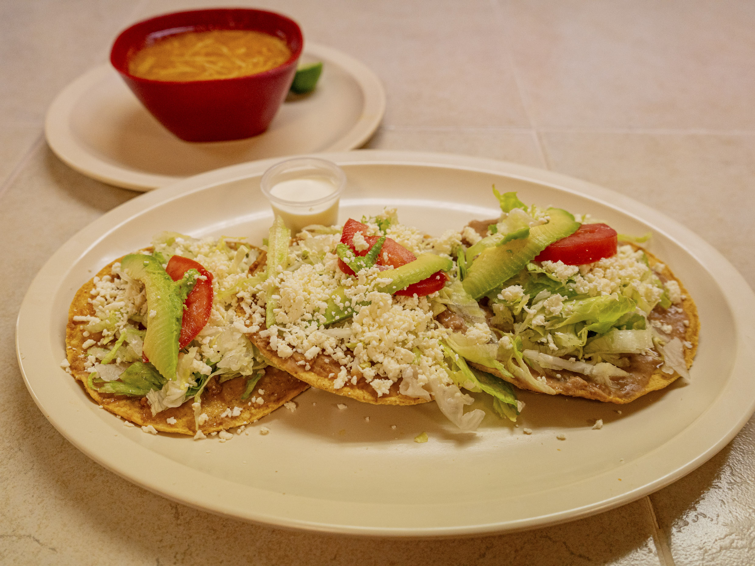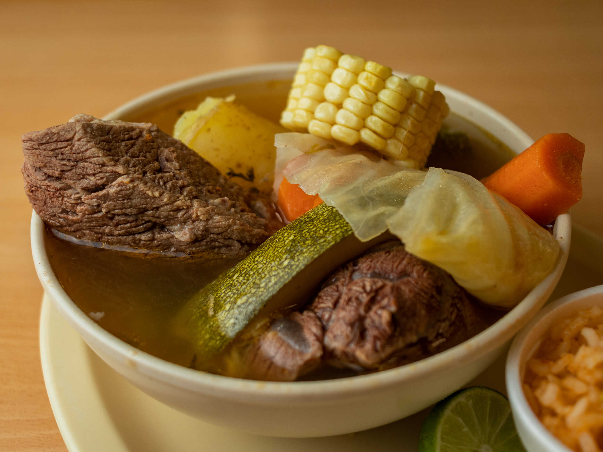 Caldo de pollo guisado con chipotle, una pieza de pollo, queso, aguacate y chipotle.
