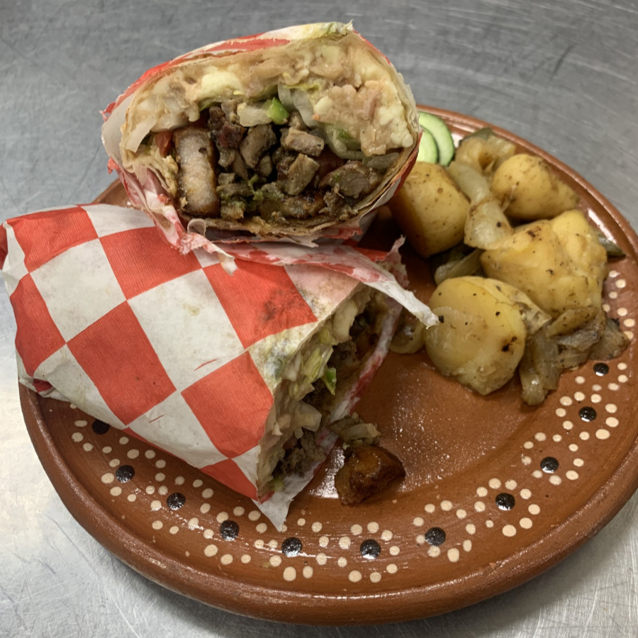 Burro en tortilla de harina de 35 cm, relleno de carne de arrachera, crujiente papada de cerdo, queso suizo, frijol con veneno, aguacate, pico de gallo, fresca lechuga, cebolla y aderezo bbq habanero, todo dentro del burro, acompañado de sancocho de papa, nopal y cebolla