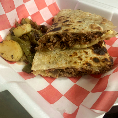 1 Tortilla de harina de 27cm, rellena de carne de res (bistec) y queso suizo, la pieza es frita, se acompaña de salsa