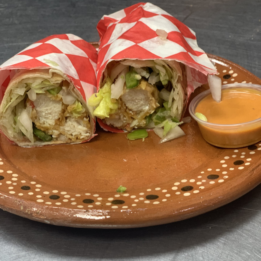 Tortilla de Harina de 25cm, rellena de tiras de pechuga de pollo frito salseadas en aderezo bufalo, lechuga, tomate y cebolla cruda