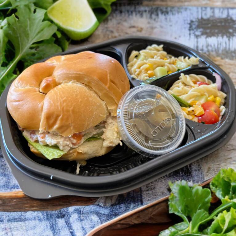 Cuernito relleno de ensalada fría de pollo, acompañada de ensalada fría de pasta fusilli