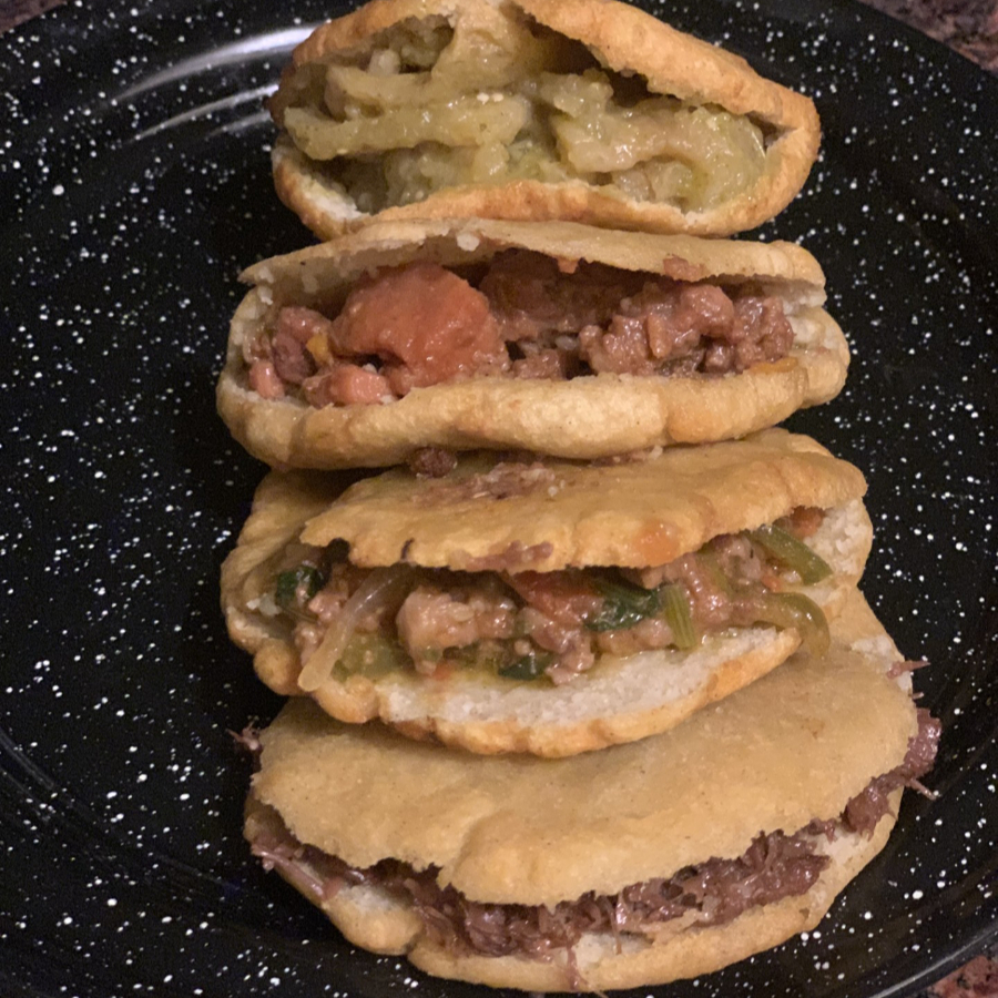 4 gorditas de guisados (bistec ranchero, discada, alambre y barbacoa)