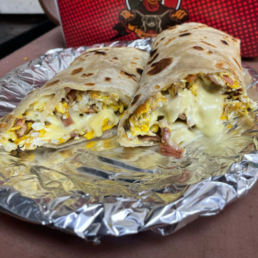 Tortilla de harina grande rellena de huevo con crujiente tocino y queso suizo