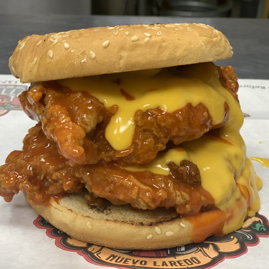 Burger con 2 filetes de pechuga de pollo deliciosamente sazonadas y fritas, bañadas en aderezo bufalo, con queso cheddar