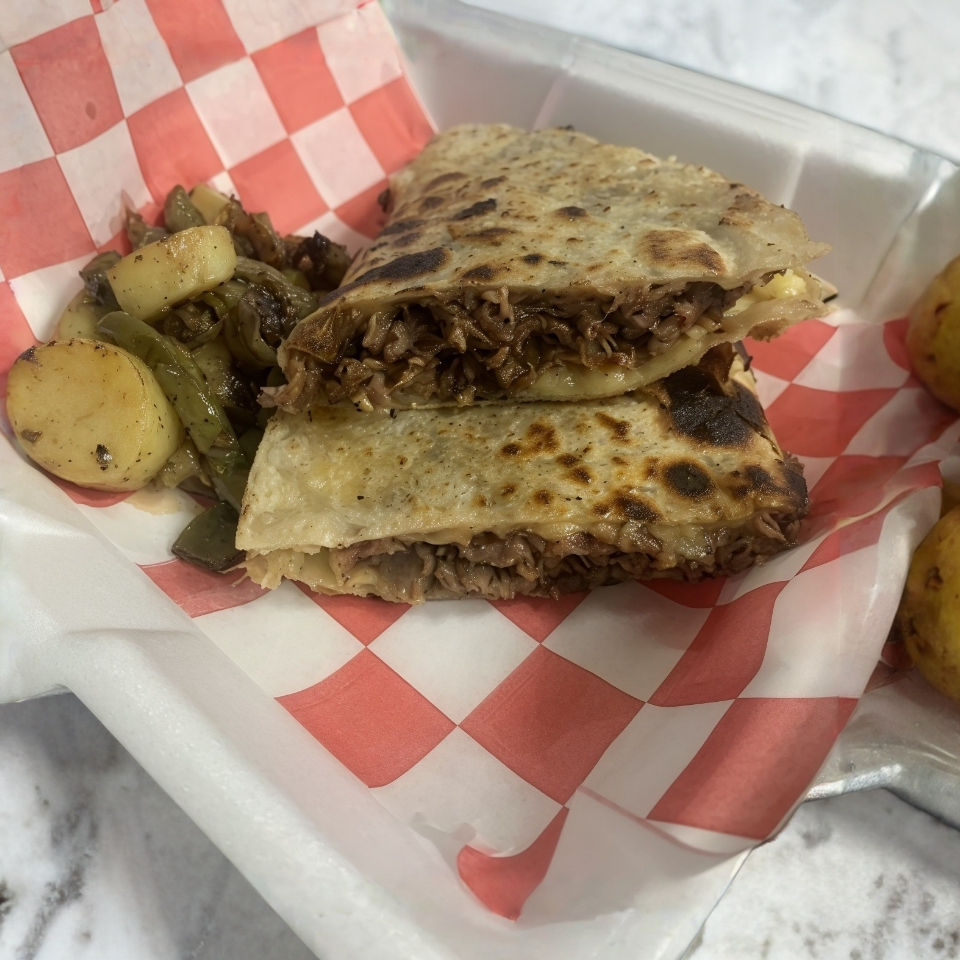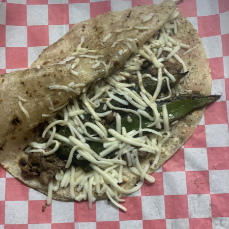 1 Tortilla de harina gigante de 27cm, rellena de carne de bistec y queso suizo, acompañada de cebolla, papa, jalapeño y nopal, totopos (triangulo de tortilla de maiz dorados) y salsa