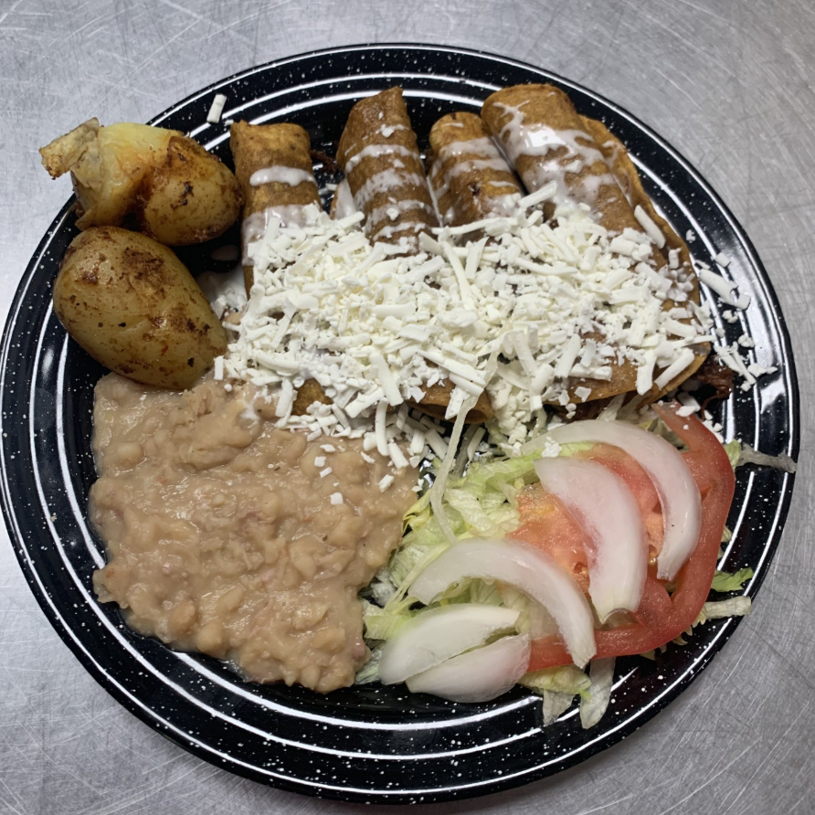 Orden de 4 flautas de pollo con crema y queso panela, acompañado de frijol puerco, papas cambray adobadas, lechuga, tomate y cebolla