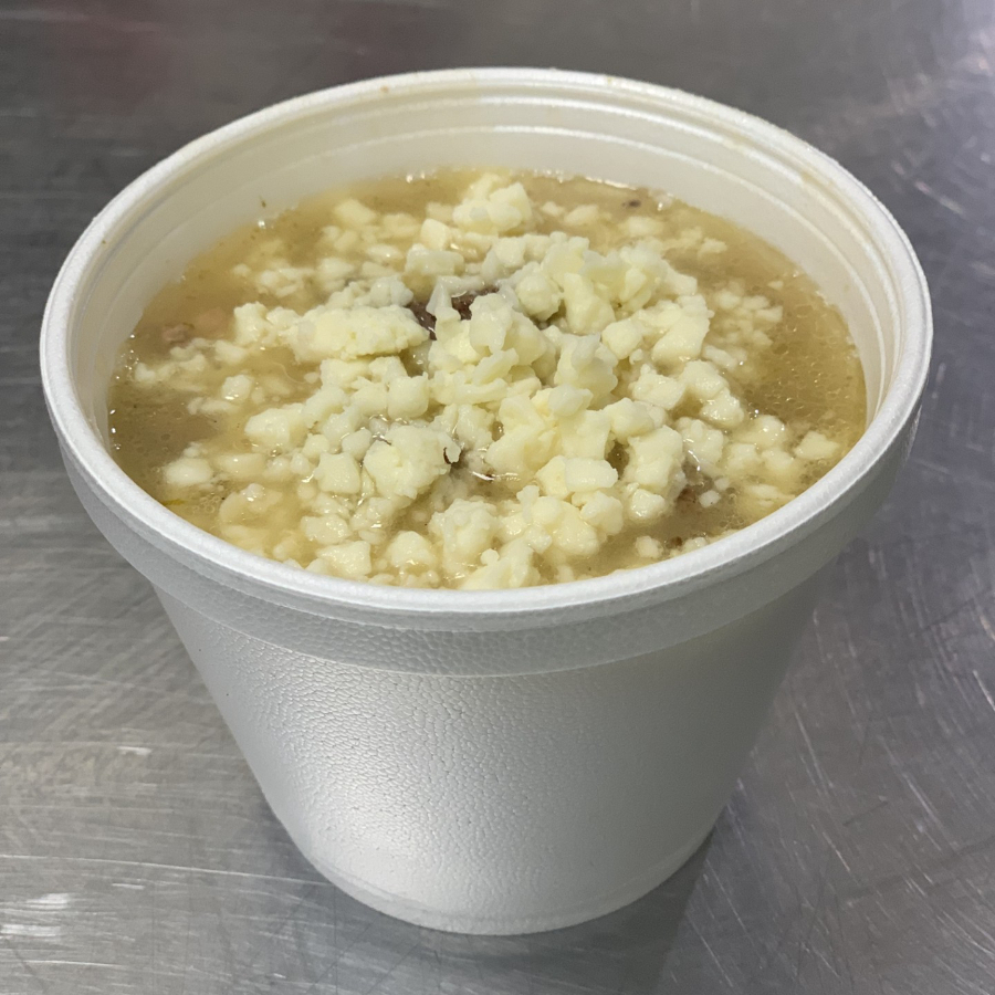 4 tacos de tortilla de harina o maiz con carne de bistec, acompañados de sancocho de cebolla, papa, jalapeño y nopal y totopos (triangulos tostados de tortilla de maiz) y salsa
