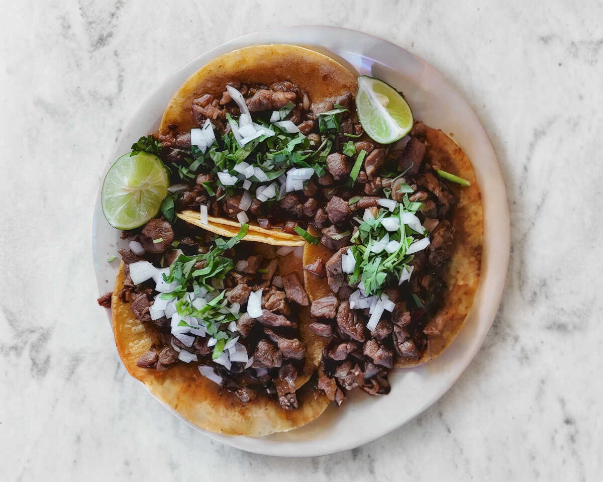 Tortilla de Harina, Carne, Frijoles en Bola, Cebolla Morada, Cilantro, Aguacate, Rabanos, Chile Toreado