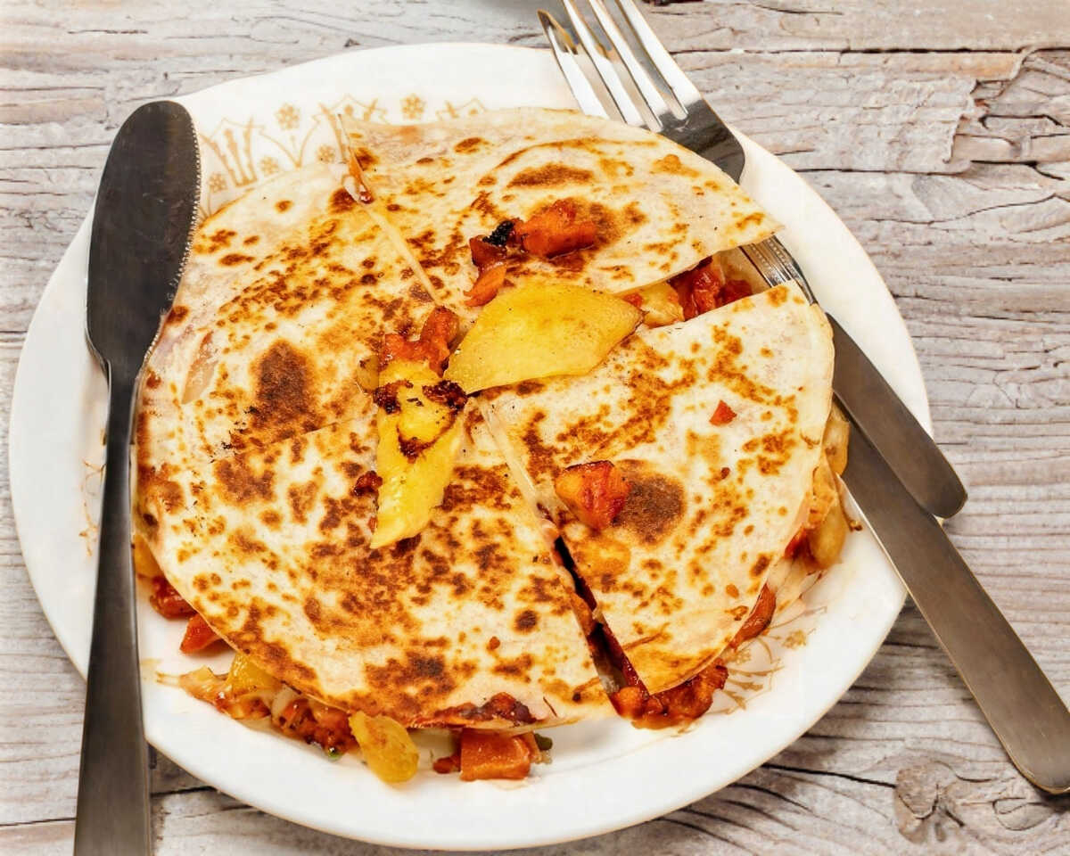 2 tortillas de harina, pastor, queso y piña