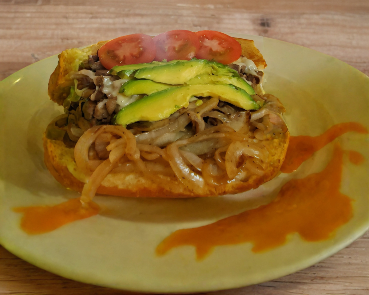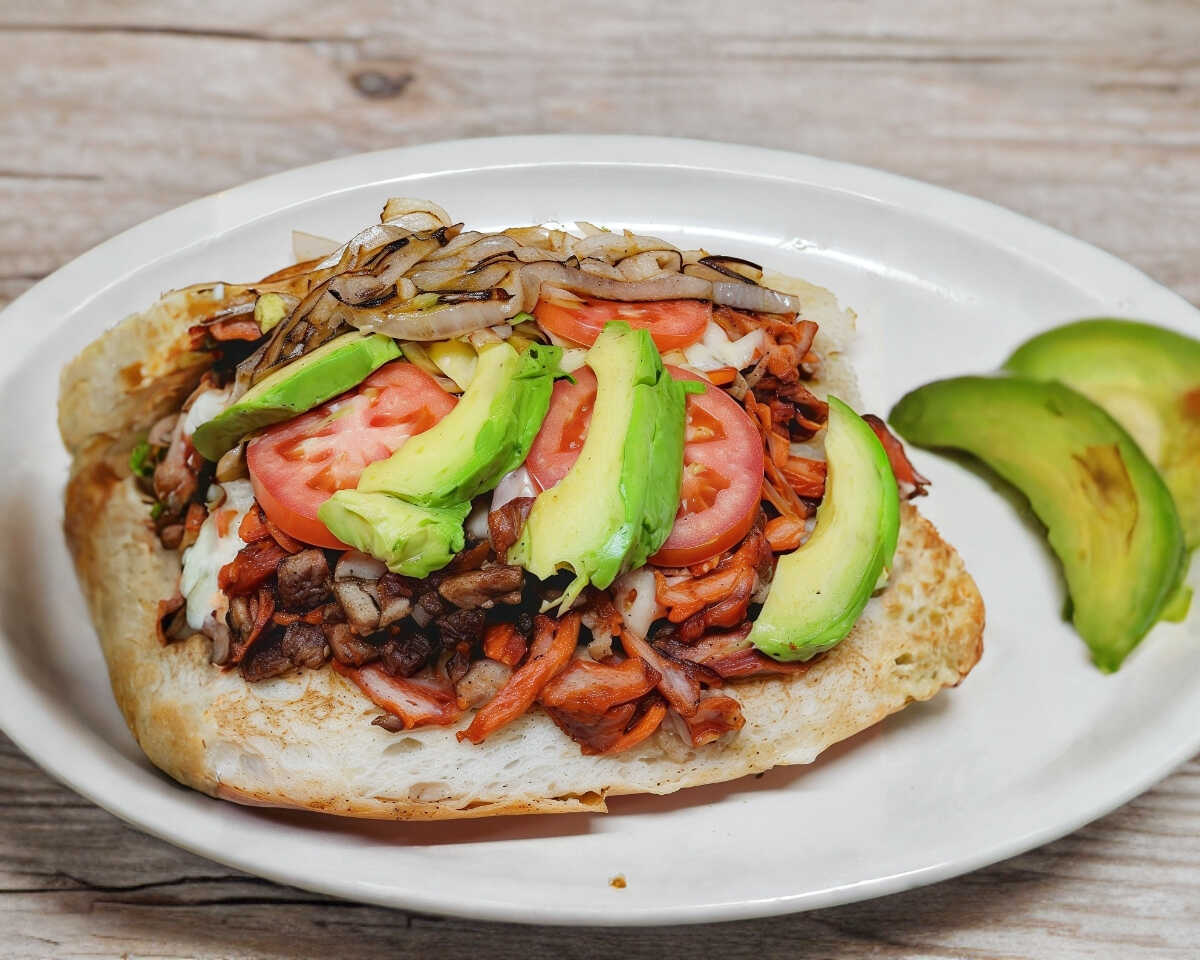Pan bolilo, Carne Bistec, Cebolla asada, Tomate, Aguacate