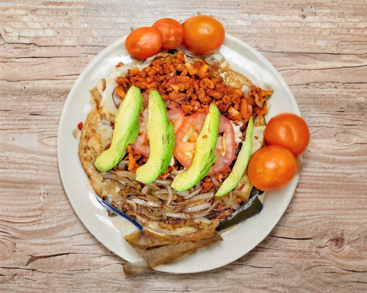 Pan, Carne de Pastor, Cebolla Asada, Tomate Aguacate y Queso