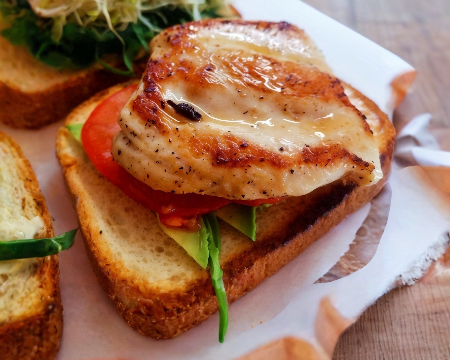 Pan a elegir, mayonesa hecha en casa, pechuga de pollo a la plancha, tomate, aguacate, germinado de alfalfa y espinacas, acompañado de aderezo de chipotle casero y salsa macha morita y arándanos.