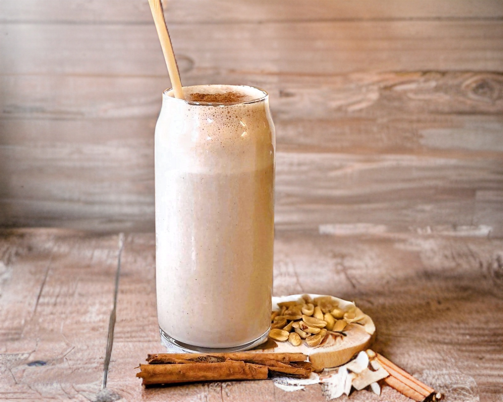 Leche a escoger, plátano, crema de avellanas, cacahuate. Canela, hielo.
