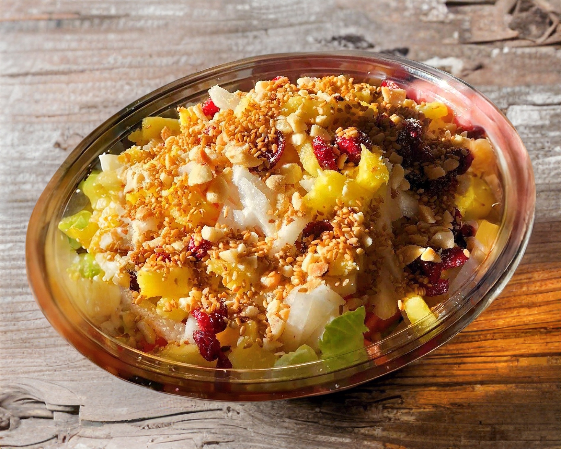 Lechuga romana, espinacas, col morada, zanahoria, jícama, piña, arándano deshidratado, cacahuate, ajonjolí garapiñado y vinagreta de naranja con romero.