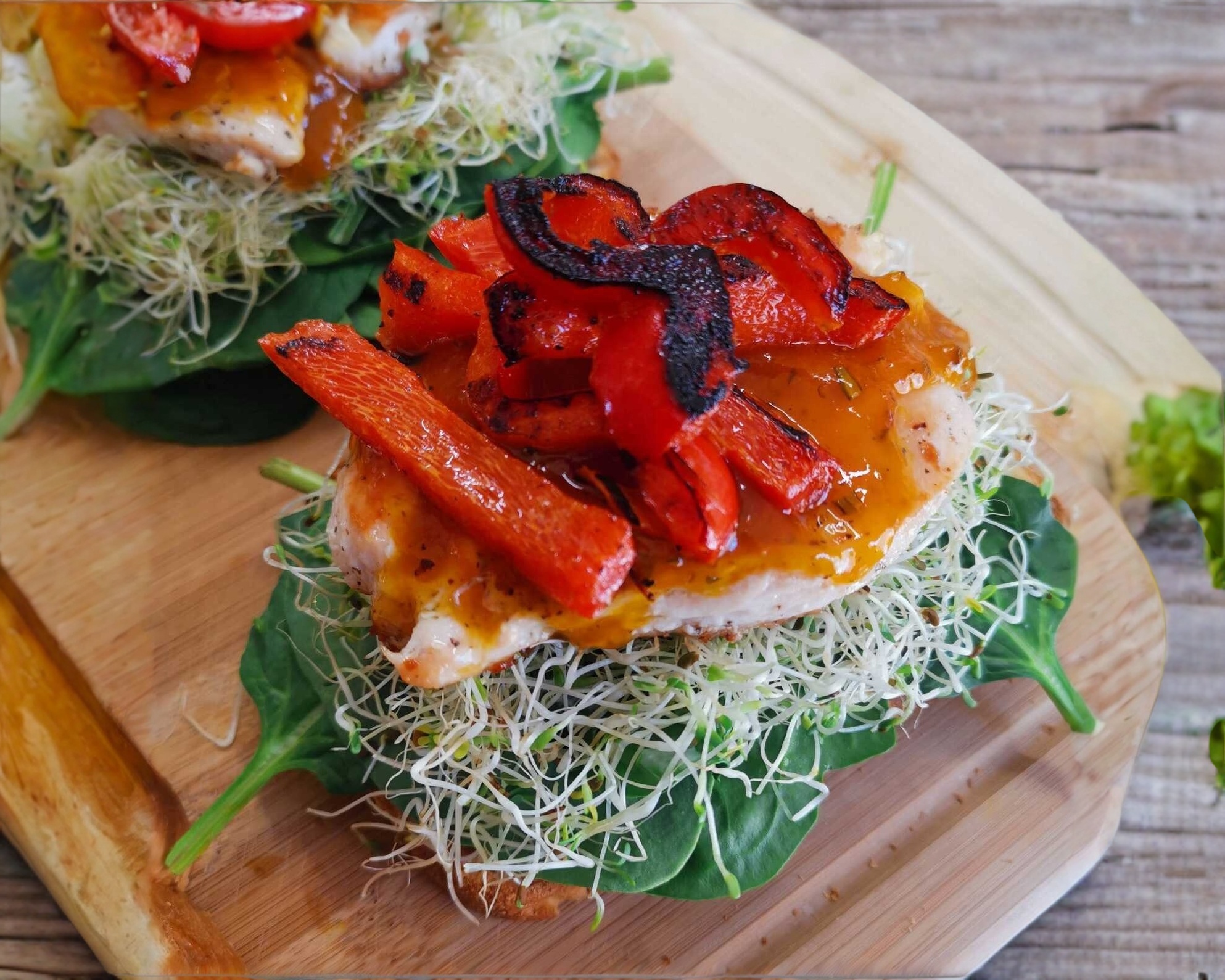 Pan a elegir, mayonesa hecha en casa, pechuga de pollo a la plancha, pimiento rojo toreado, queso de cabra, germinado de alfalfa y espinacas, acompañado de mermelada casera de pimiento y romero y salsa macha morita y arándanos.