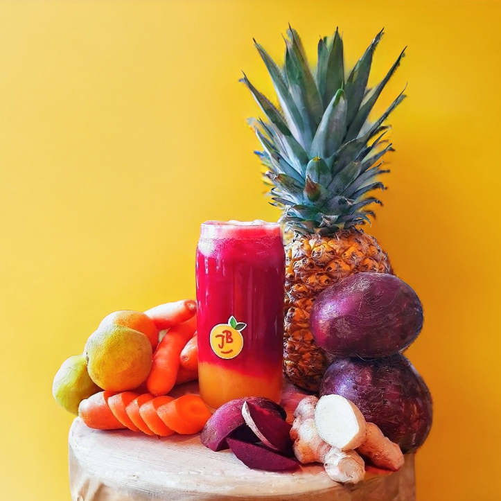 Jugo cold press 100% natural hecho al momento con manzana, naranja, betabel, zanahoria, apio, jengibre.