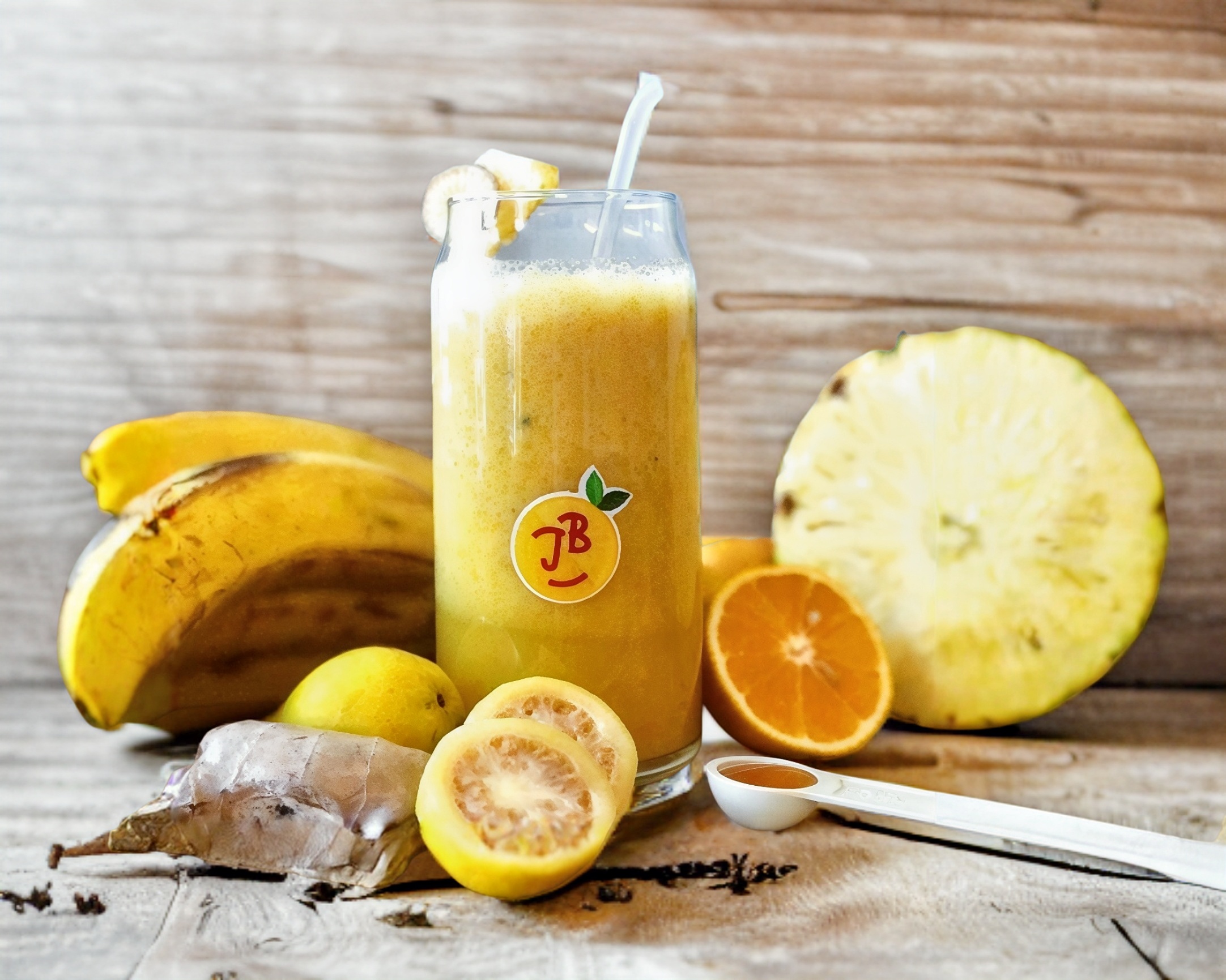 Jugo de naranja, piña, plátano, guayaba, jengibre, miel de abeja, hielo.