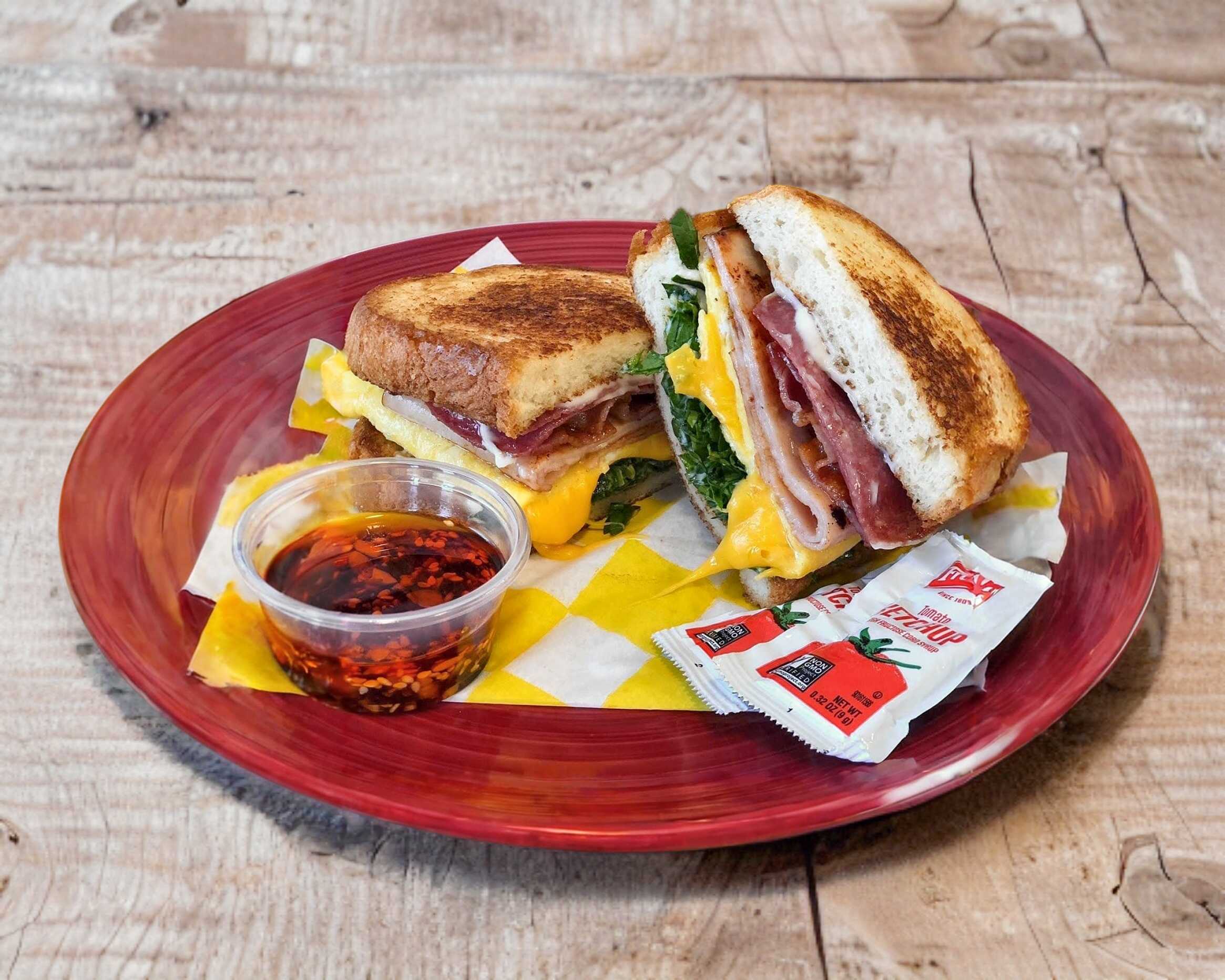 Pan a elegir, mayonesa hecha en casa, omelette de huevo y queso americano, jamón de pechuga de pavo ahumado Oscar Mayer, salami, tocino y espinacas, acompañado de sobres de ketchup y salsa macha morita y arándanos.