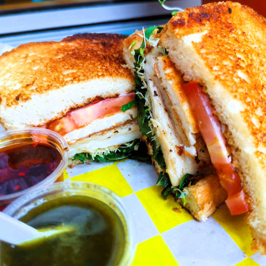 Pan a elegir, mayonesa hecha en casa, pechuga de pollo a la plancha, queso panela asado, tomate fresco, germinado de alfalfa y espinacas, acompañado de pesto de la casa y salsa macha morita y arándanos.