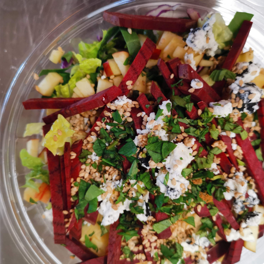 Lechuga romana, espinaca, col morada, manzana, betabel, ajonjolí, garapiñado, queso de cabra, hierbabuena, pimienta y vinagreta de piña.