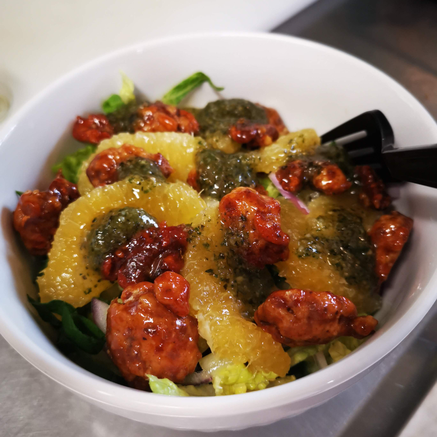 Lechuga romana, espinacas, col morada, suprema de naranja, nuez garapiñada artesanal, cebolla morada. (recomendamos pesto de albahaca artesanal)