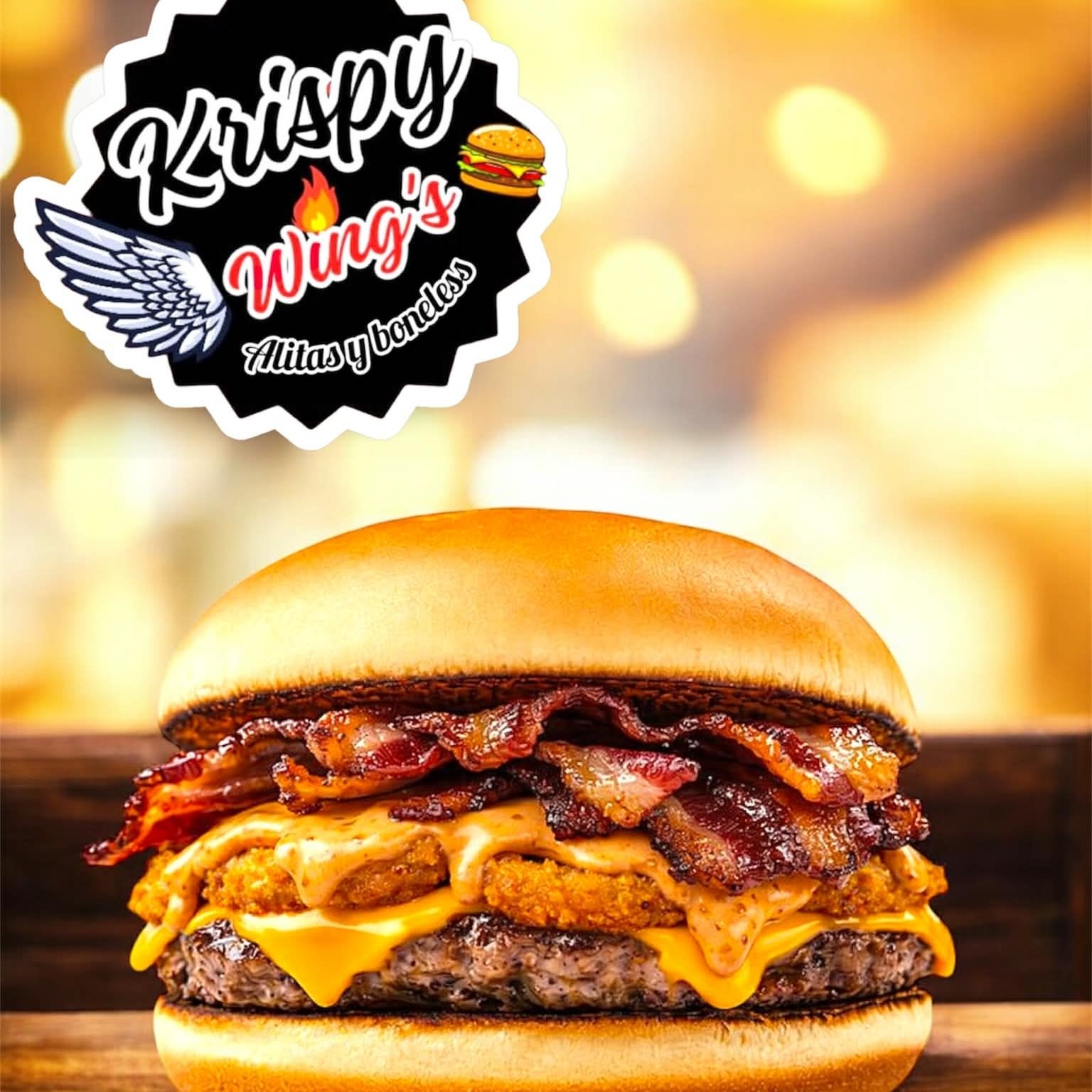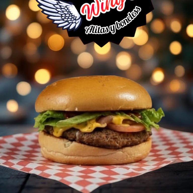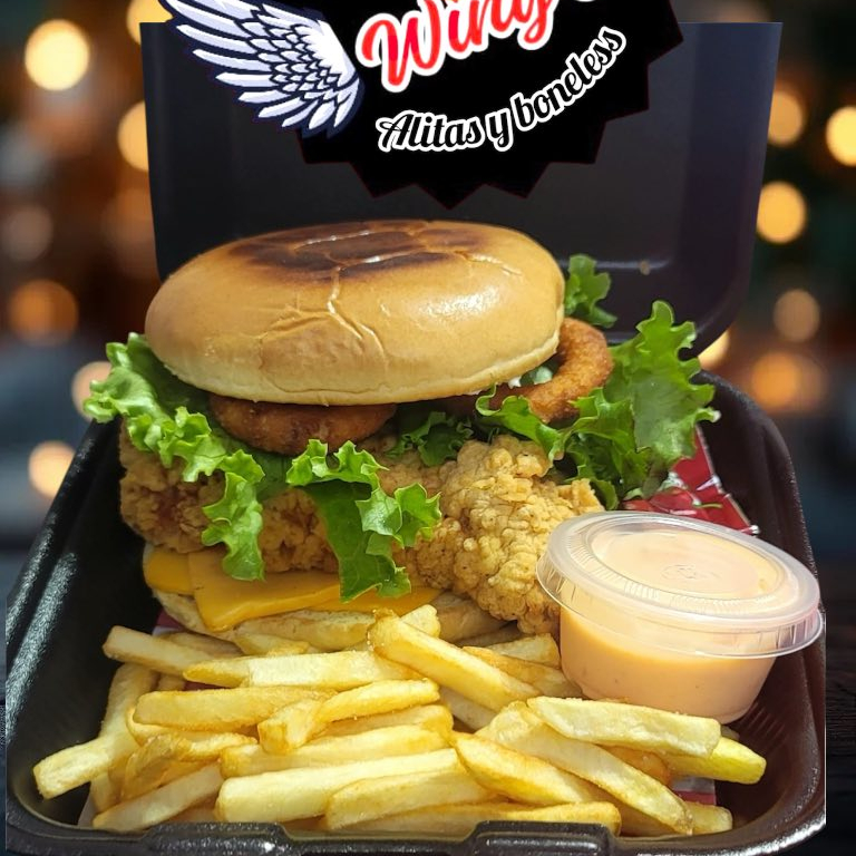 Carne de res, queso cheddar, aros de cebolla, mayoneza, aderezo chipotle, pepinillos y papas fritas