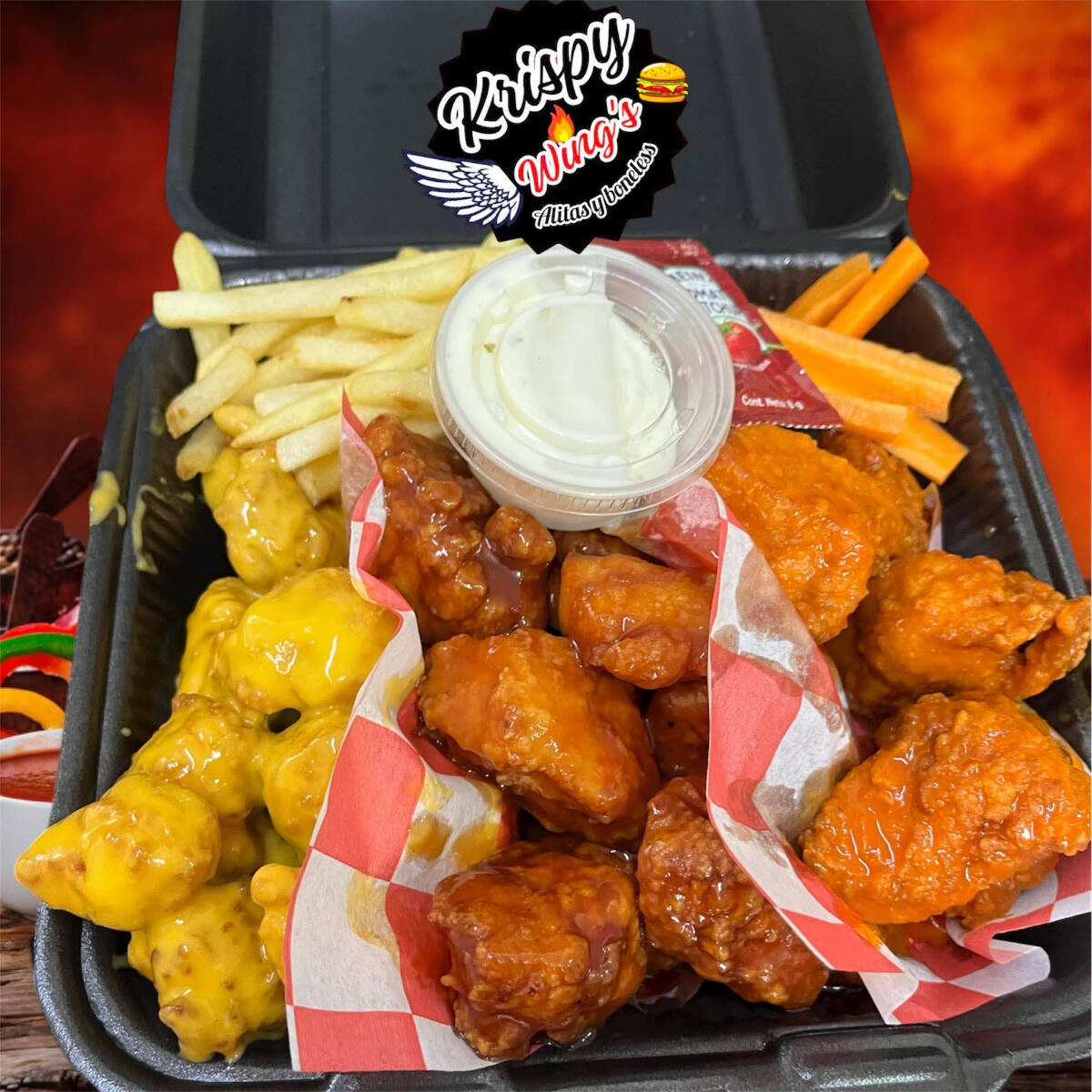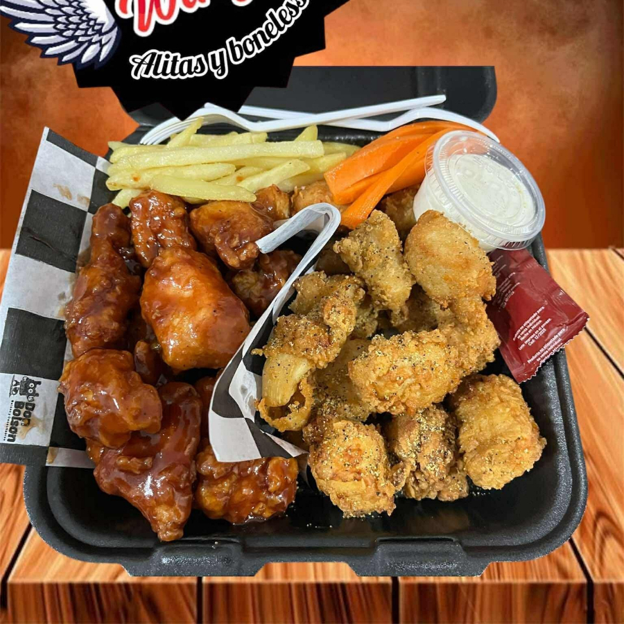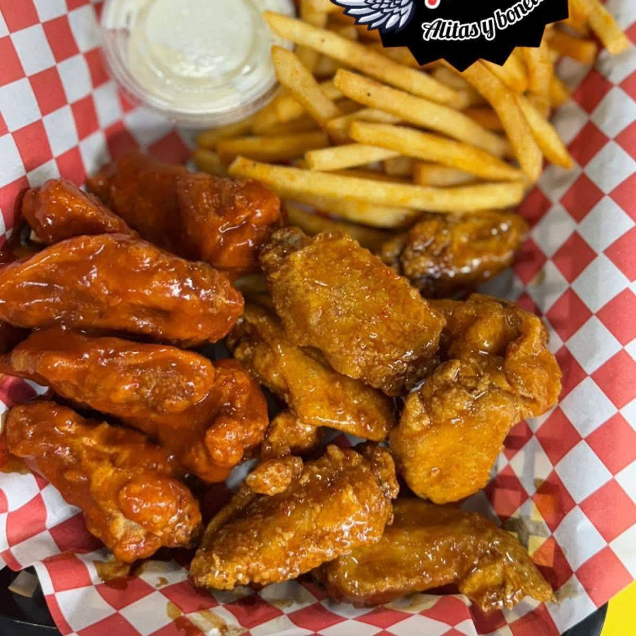 3 sabores a elejir, papas, aderezo y ranch