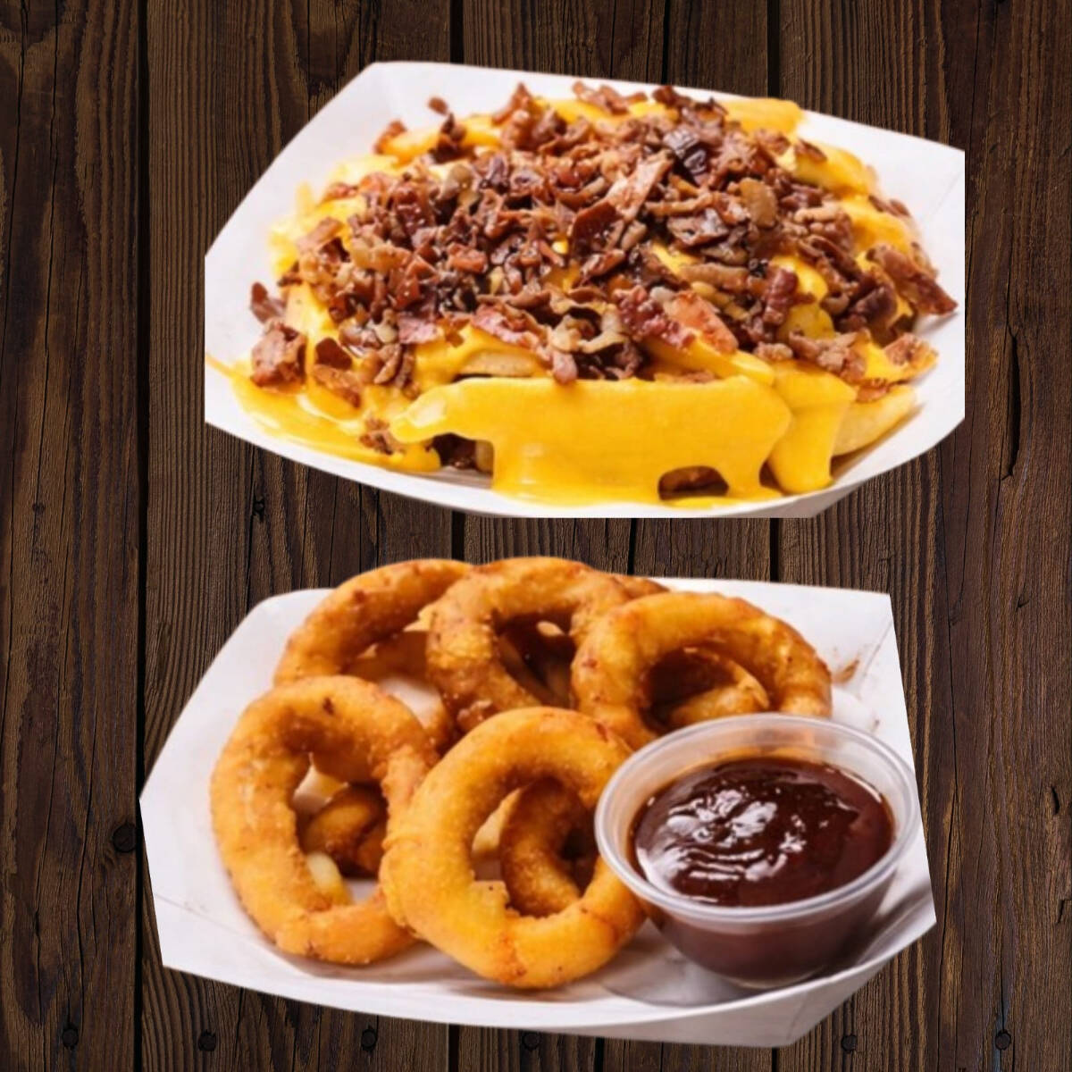 Aros de Cebolla*1 + Papas con Queso y Tocino*1